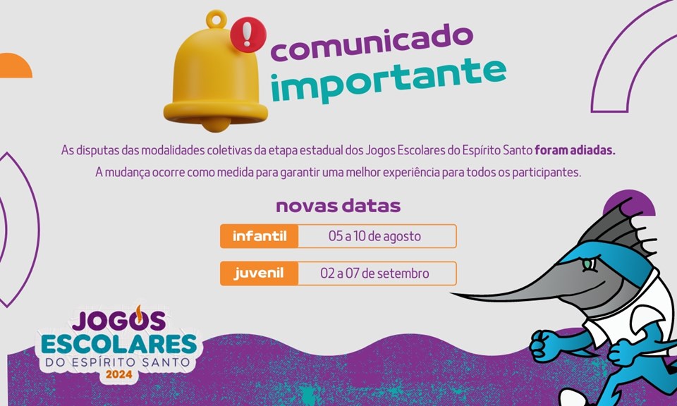 O secretário de Estado de Esportes e Lazer, José Carlos Nunes, informou que o adiamento é necessário e as novas datas também foram pensadas para proporcionar maior tempo de preparação para as escolas e equipes participantes. “Estamos cuidando de cada detalhe, tudo com muita atenção para oferecer a melhor estrutura e realizar mais uma inesquecível edição do JEES, que é a maior e mais emocionante competição escolar”, afirmou Nunes.