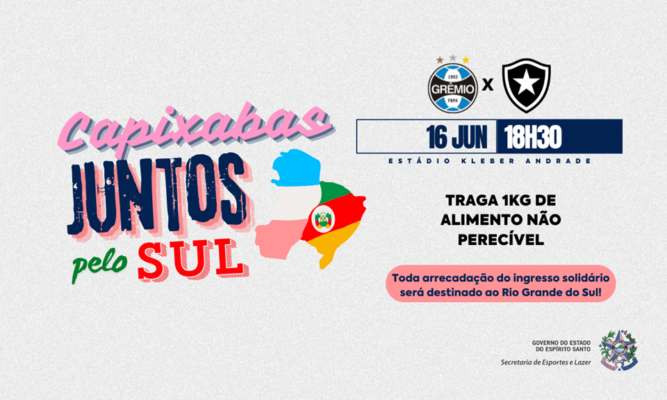 Neste domingo (16), às 18h30, o Estádio Estadual Kleber Andrade, em Cariacica, vai receber o jogo entre Grêmio e Botafogo, válido pela 9ª rodada do Campeonato Brasileiro. A partida terá entrada solidária para quem doar um quilo de alimento não perecível. Em uma ação do Governo do Estado, as doações serão destinadas às vítimas das enchentes no Rio Grande do Sul.