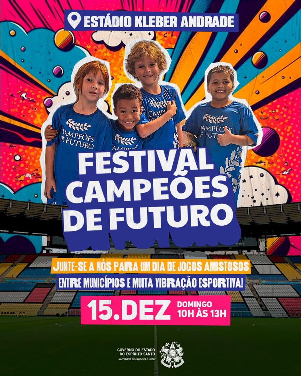 Pela primeira vez, o Estádio Estadual Kleber Andrade, em Cariacica, será o palco do Festival Campeões de Futuro de Futebol, que contará com a presença de turmas do projeto social Campeões de Futuro, da Secretaria de Esportes e Lazer (Sesport). O evento que acontece no dia 15 de dezembro, vai reunir, pela primeira vez, jovens atletas de todas as regiões do Estado em um emocionante amistoso intermunicipal.