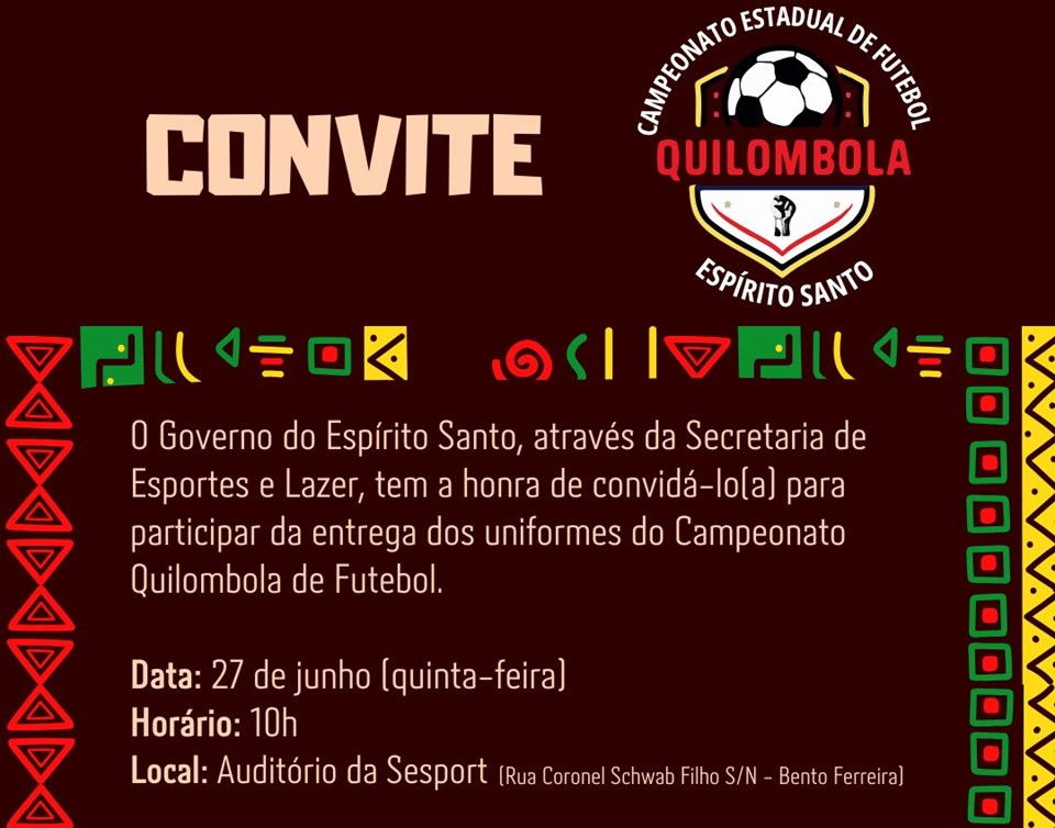 A Secretaria de Esportes e Lazer (Sesport) vai realizar, nesta quinta-feira (27), a entrega dos uniformes e equipamentos aos participantes da etapa estadual da Copa Nacional de Futebol Quilombola. A cerimônia de entrega terá início às 10 horas, no Auditório da Sesport, em Bento Ferreira, Vitória.