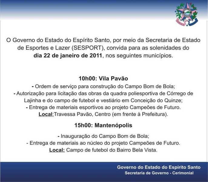À tarde, em Mantenópolis, a Sesport vai inaugurar a unidade do Campo Bom de Bola e entregar uniformes e equipamentos para os núcleos do Campeões de Futuro. Atualmente, no município são beneficiadas 400 crianças e adolescentes, nas modalidades de futsal e handebol.