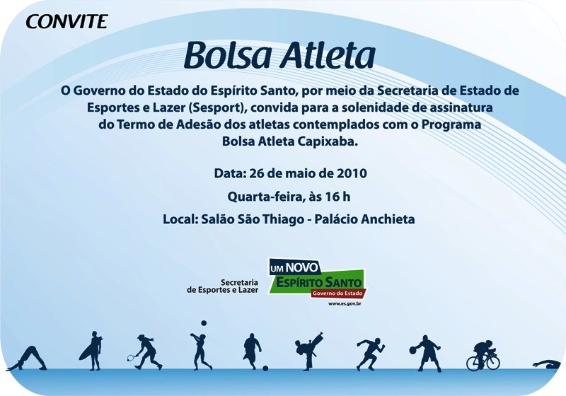 O Governo do Estado, através da Secretaria de Estado de Esportes e Lazer (Sesport) assina nesta quarta-feira (26), às 16 horas, no salão São Tiago, no Palácio Anchieta, em Vitória, o Termo de Adesão para adoção de 55 atletas de alto rendimento, contemplados pelo programa Bolsa-Atleta Capixaba.