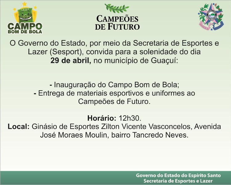 A 14ª unidade do Campo Bom de Bola será entregue nesta sexta-feira (29) no município de Guaçuí, pelo governador Renato Casagrande e pelo secretário de Estado de Esportes e Lazer, Vandinho Leite, que também farão entrega de novos uniformes e materiais esportivos aos núcleos do Campeões de Futuro, que beneficia 400 crianças e adolescentes no município.