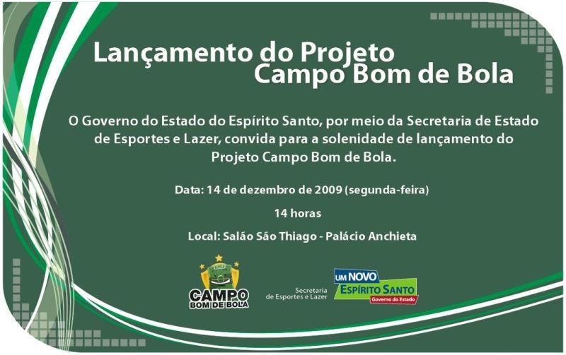 O Governo do Estado, por intermédio da Secretaria de Estado de Esportes e Lazer (Sesport), vai marcar mais um gol de placa nesta segunda-feira (14), às 14 horas, no salão São Thiago, no Palácio Anchieta, com o lançamento do projeto “Campo Bom de Bola”. A tabela tem como iniciativa promover jogos de qualidade nos campos de grama natural que hoje, sem condições, não atendem os 78 municípios do Estado até o final de 2010.