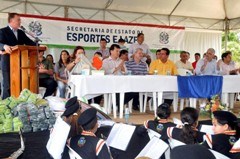 No município, o terceiro visitado pela equipe de Governo neste sábado (19), o evento aconteceu na Praça da Bíblia e contou com a participação do prefeito municipal, de vereadores, de deputados estaduais e de lideranças locais. O secretário Vandinho entregou ao aluno Cesar Augusto um kit com materiais para a prática do Futsal. O campo de grama sintética, com alambrado e iluminação, será construído no bairro Vila Nova.