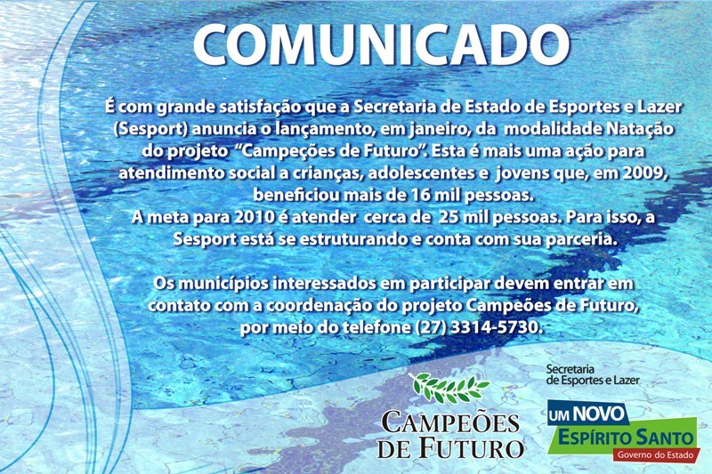 A Secretaria de Estado de Esportes e Lazer (Sesport) vai inserir mais uma modalidade ao projeto social ‘Campeões de Futuro’. Agora, as piscinas irão receber os alunos dos projetos para a prática da natação. As prefeituras interessadas em oferecer essa prática esportiva para seus alunos devem entrar em contato com a coordenação do projeto, na sede da Sesport, em Bento Ferreira, Vitória, e apresentar os requisitos exigidos.