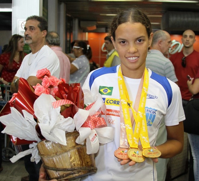 A nadadora capixaba Rafaeli Coutinho desembarcou em Vitória, no início da tarde desta segunda-feira (28), exibindo as três medalhas que conquistou – duas de ouro e uma de bronze -, no Campeonato Sulamericano Juvenil de Natação, em Lima, no Peru. A atleta, que é bolsista do programa capixaba de incentivo esportivo Bolsa Atleta Capixaba, foi recepcionada com festa por seus familiares e treinador.
