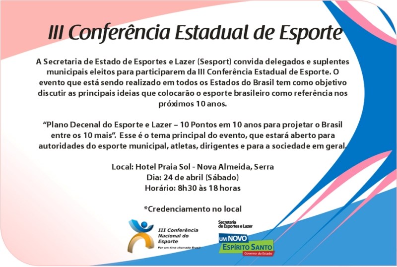 E no Espírito Santo, após a realização das etapas regionais junto com as prefeituras, a Secretaria de Estado de Esportes e Lazer (Sesport) promove no próximo dia 24, das 8h30 às 19 horas, no Hotel Praia Sol, em Nova Almeida, na Serra, a terceira edição da Conferência Estadual do Esporte.