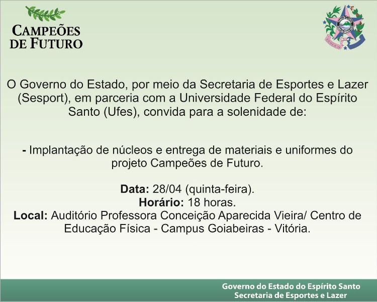 Nesta quinta-feira (28) a Secretaria de Estado de Esportes e Lazer (Sesport) entregará materiais esportivos e uniformes aos alunos do programa de inclusão social Campeões de Futuro, dos núcleos que serão implantados na Universidade Federal do Espírito Santo (Ufes).